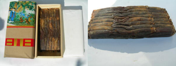 そのために、紅参として出来上がった人参をもう一度やわらかく蒸して、何本もまとめて圧縮する過程が付け足されるわけです。
